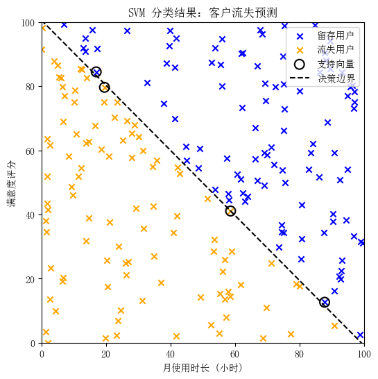- 包含月使用时长、满意度评分和是否流失数据