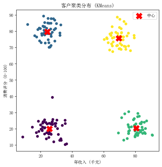 print(f"簇{idx}: 年收入={center[0]:.1f}k, 消费评分={center[1]:.1f}")